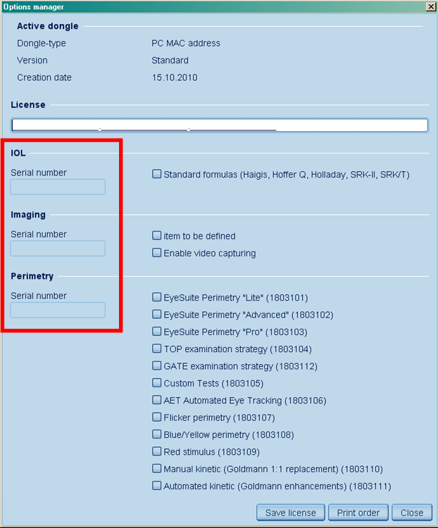 If you purchased options with your instrument or software, you need to activate them by entering a "License" code into EyeSuite.