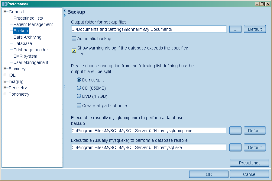 CAUTION: As the biometric database can become very large (several gigabytes in size), you should not use this option in conjunction with the LENSTAR LS 900. Use automatic export of all measurement and analysis data to a network-drive instead to secure data.