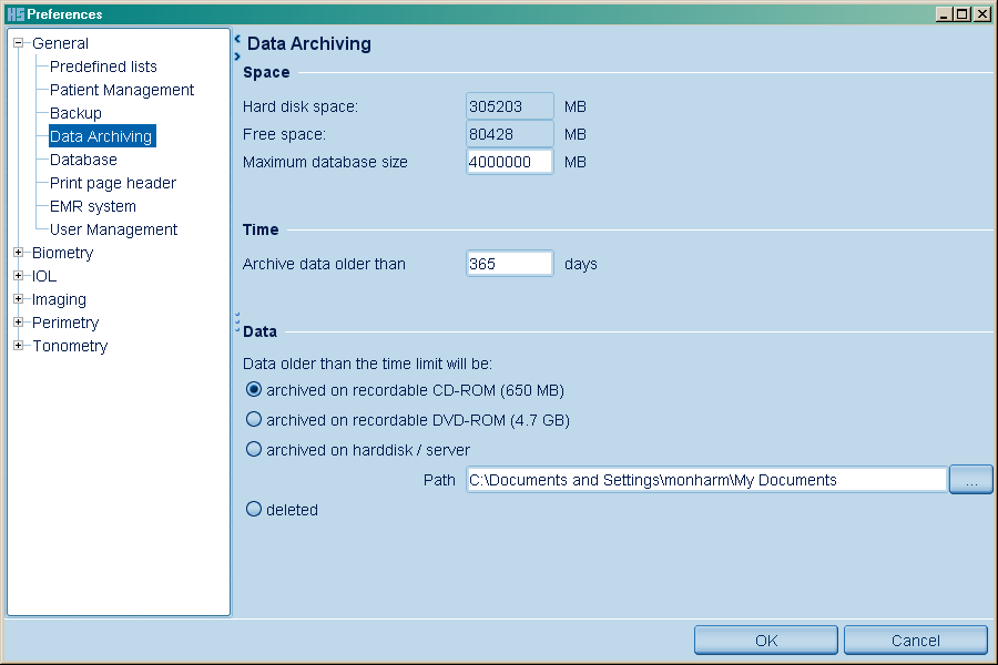 Maximum size of database: This function lets the user decide how big the database should become before it is archived. The recommended value is approximately 15GB (corresponding to about 500 left/right eye examinations). As soon as this default value is reached or exceeded, the user is recommended to archive the data at the next start-up of EyeSuite. This can also be done at a later time, or carried out manually. The data-archiving procedure is described in the section entitled "Data archiving / compression".