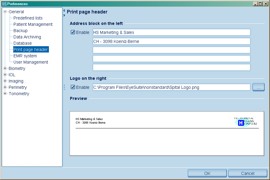 This feature lets you personalize the header line for EyeSuite printouts allowing to add your own address and/or logo. The logo is automatically scaled depending on the number of used lines in the header. Click on the "Enable" button to make the address and logo, which you have entered, appear on your printouts. The window displayed below gives you a preview of how the header will look like on the printouts.