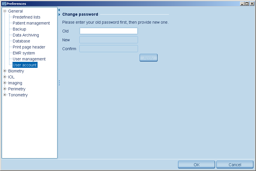 If multi-user mode has been activated you may change the password for the EyeSuite "admin" here. In single user mode of EyeSuite, you may not see this section.