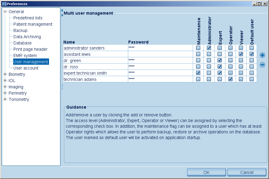 Once turning on the multi-user mode, EyeSuite requires a login and the definition of functions/access rights for each user to work properly. We recommend working with this feature only in a biometry multi-user environment.